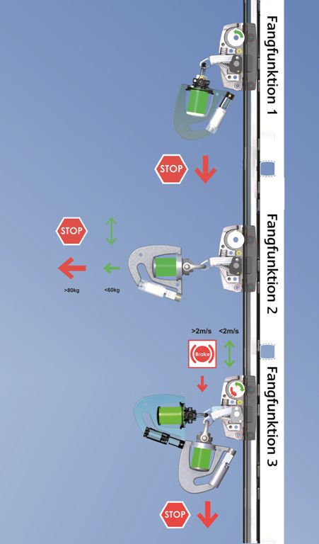 immer die vertikale als zweite Redundanz ausgelöst! 1. Fangfunktion: Vertikale Fangfunktion Bei einem Sturz bewegt der durch den Karabiner am