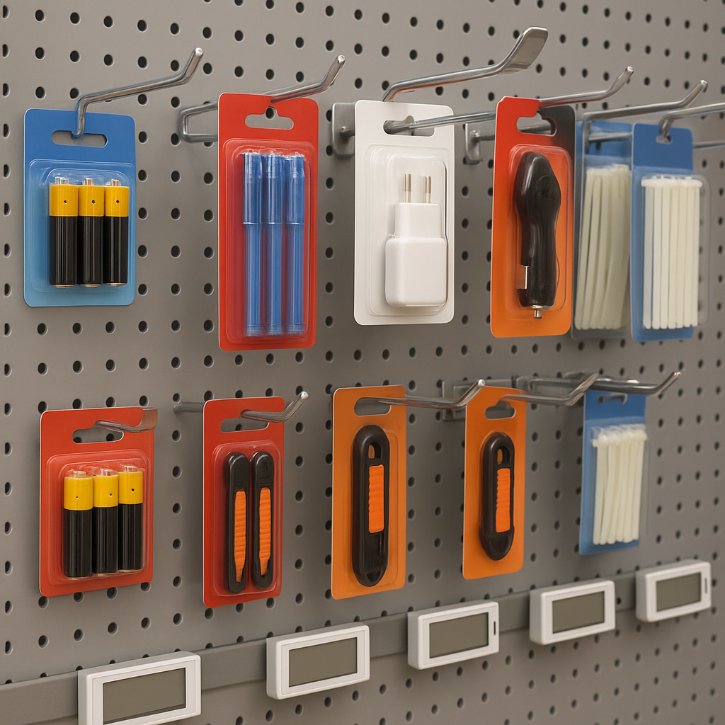 Die Lochwandhaken gehören in jeden Verkaufsraum. Der Vorteil der Haken ist, dass unförmige oder instabile Verpackungen (Tüten, Folien) und jede Art von Blisterverpackungen mit Hilfe der Eurolochung