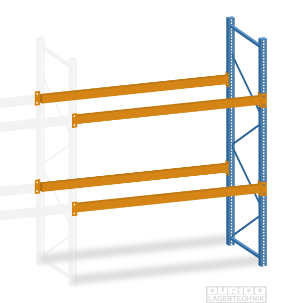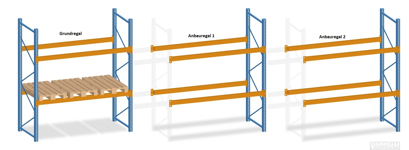 Wichtig: Die Abbildung zeigt nur ein Grundfeld mit ca. 2.700mm Breite, im Lieferumfang befindet sich außerdem ein Anbaufeld (= Gesamtbreite 5.640mm). Pro Feld können 3 Paletten nebeneinander